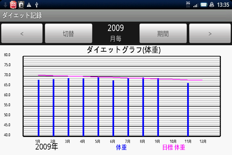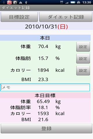 目標を設定することで、毎日の目標体重が表示され、それを目指すことで、計画的にダイエットを行うことが出来ます。