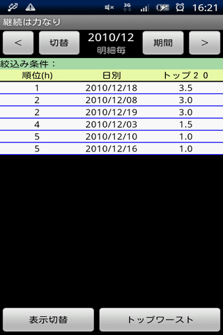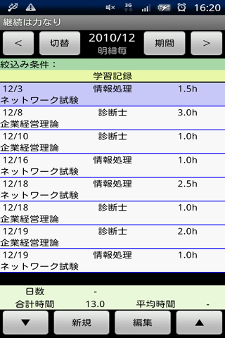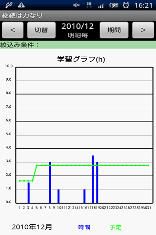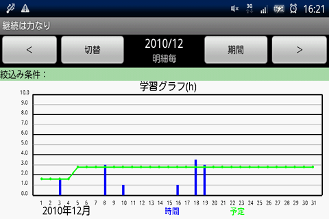 科目毎に目標時間と期間を入力することで、一日毎の学習科目の予定時間が表示されます。