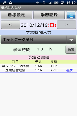 ツイッターアプリケーションに学習状況をツイートできます。